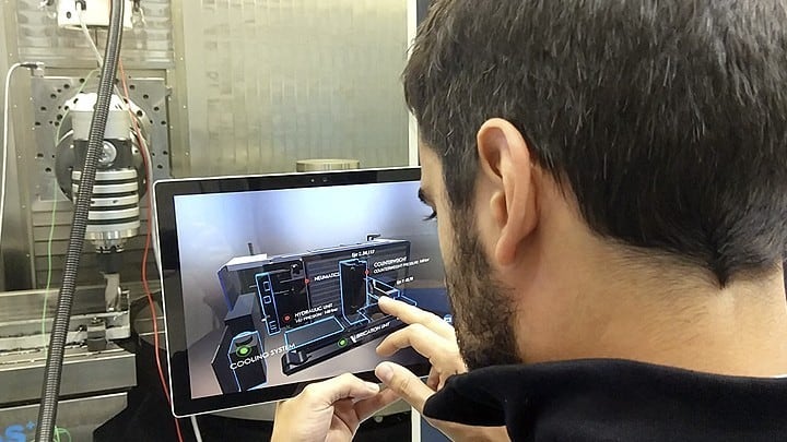 The technician can visualize real time data of the connected machine through a digital twin and access to this data by overlaying the information about the machine through augmented reality.