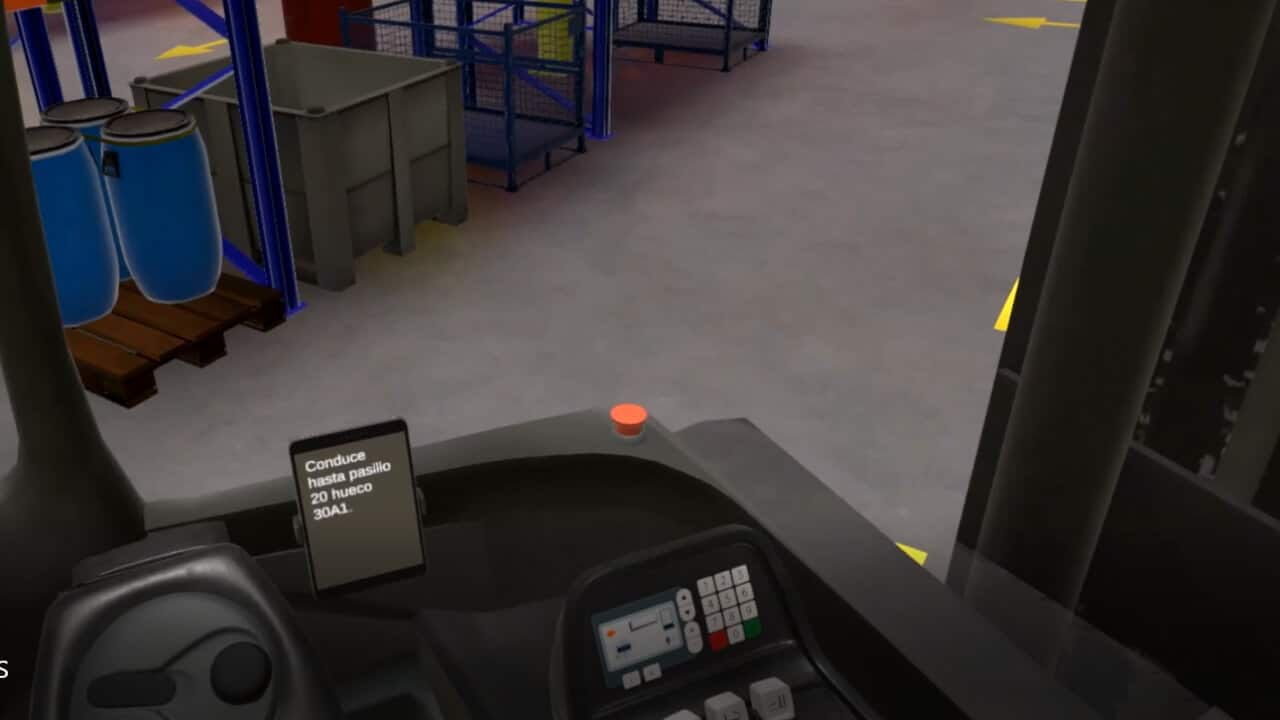 Para asegurar una formación exacta en la conducción, la simulación integra elementos de manejo reales como volante, pedales y caja de mandos para el manejo de horquillas.